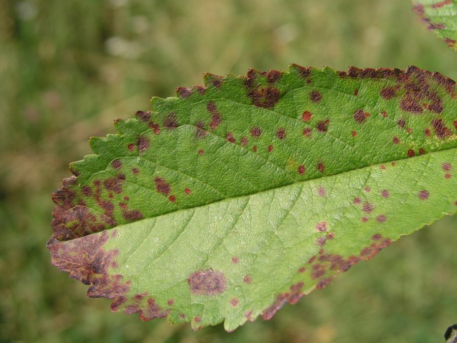 Na gornjoj strani lista se pojavljuju male, crvenkastoljubičaste pege. Sa donje strane listova se mogu naći beličaste spore. U slučaju jake zaraze dolazi do opadanja listova.